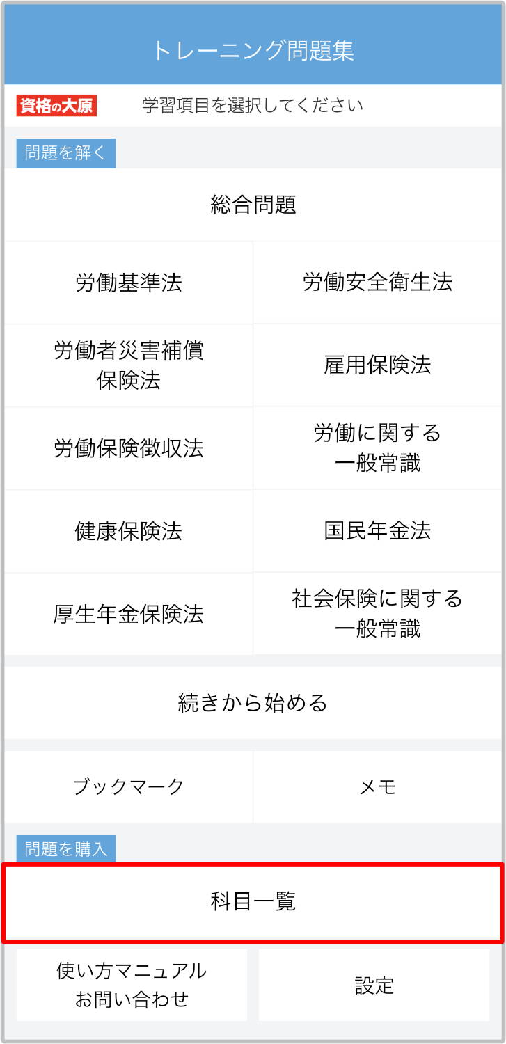 科目購入の仕方についてご説明いたします。本アプリは、必要な科目のみ科目単位で問題をご購入いただけます。未購入の状態では、各科目サンプル問題をご利用いただけます。