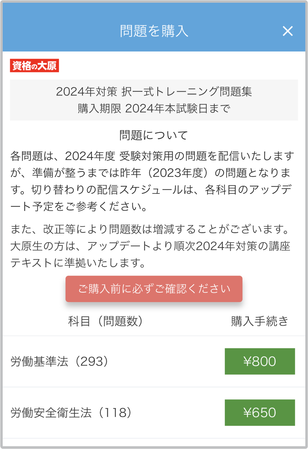 ご購入可能な科目は金額が表示され、未配信の科目は配信予定時期が表示されます。なお、2023年対策の科目販売は本試験日までとなります。