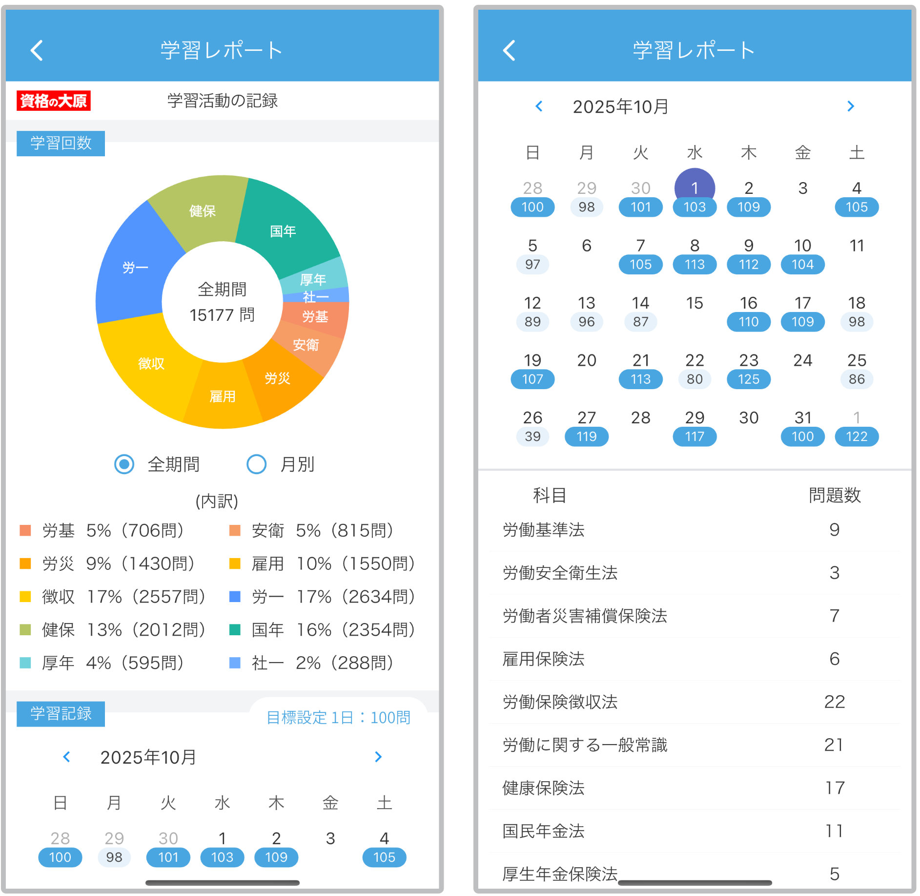 学習レポートは、問題の解いた回数を学習実績として円グラフ・カレンダー形式としてレポートする機能です。日々の学習の振り返りとしてご利用ください。