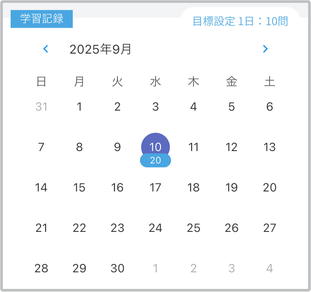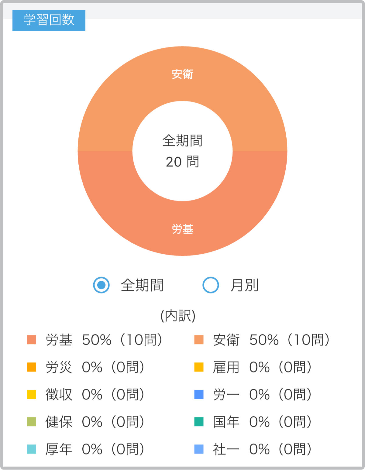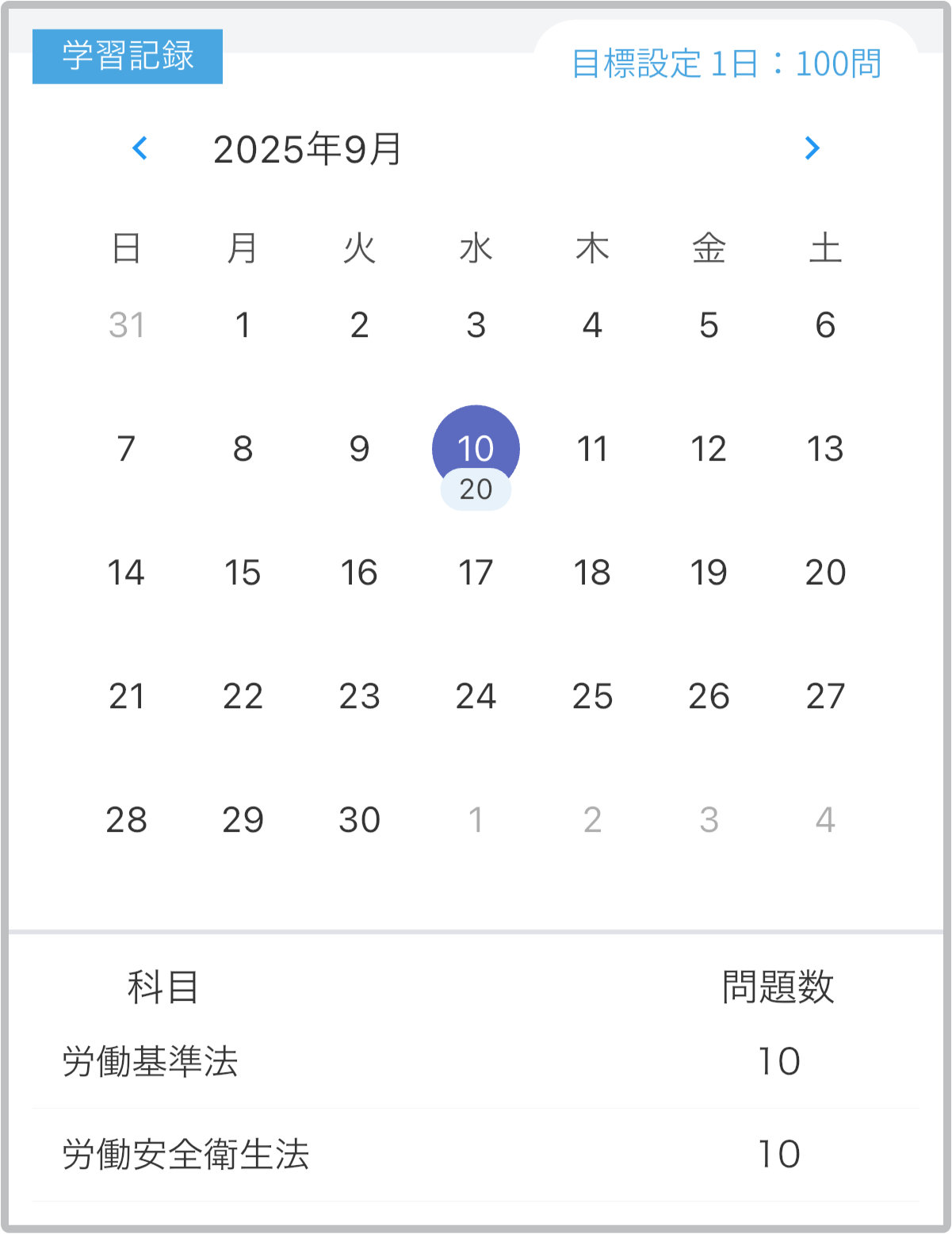 日別の実施回数を表示します。下図の例では、9月10日に20問 問題を解いた意味になり、その内訳として労働基準法10問、労働安全衛生法10問を表しています。