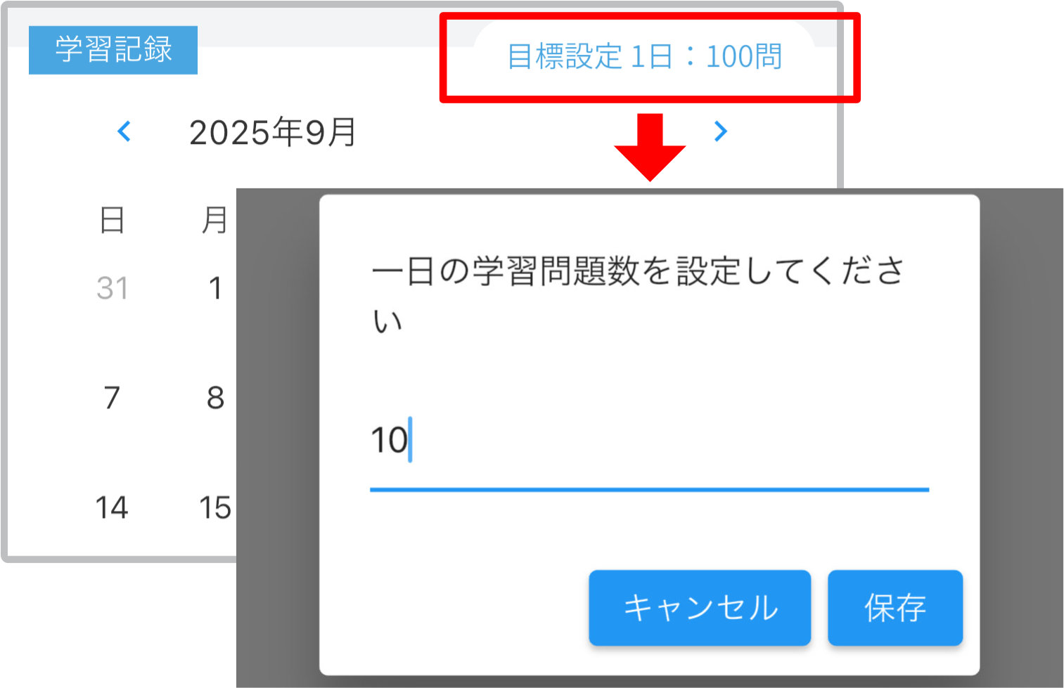 一日の目標数の設定は、「目標設定1日」から設定できます。既定は100問のため、目標に応じて変更してください。