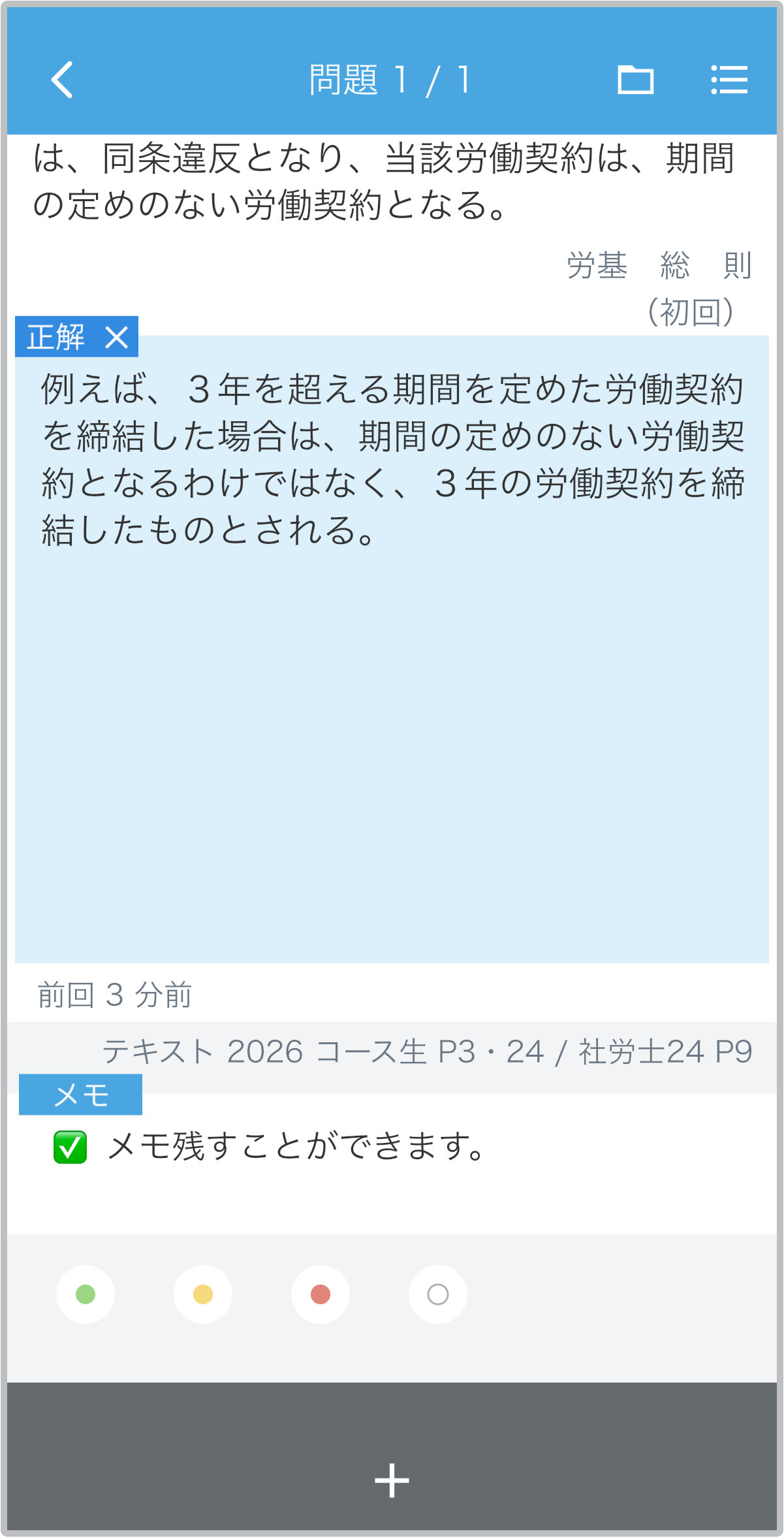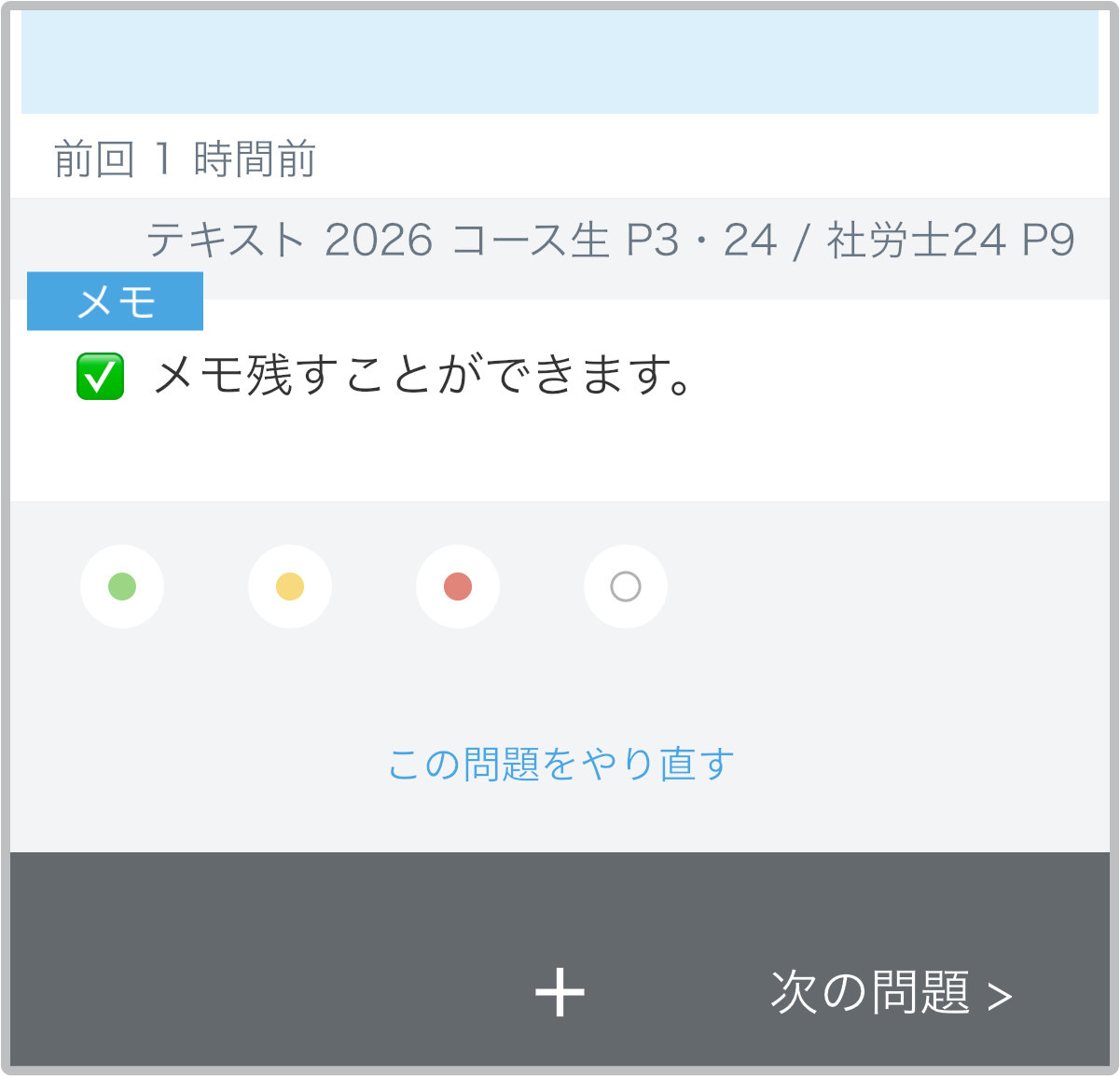 それぞれの問題にブックマーク、メモを登録することができます。登録項目は、トップ画面から一覧、および問題の抽出でブックマークのある問題、メモのある問題を抽出して出題することができます。