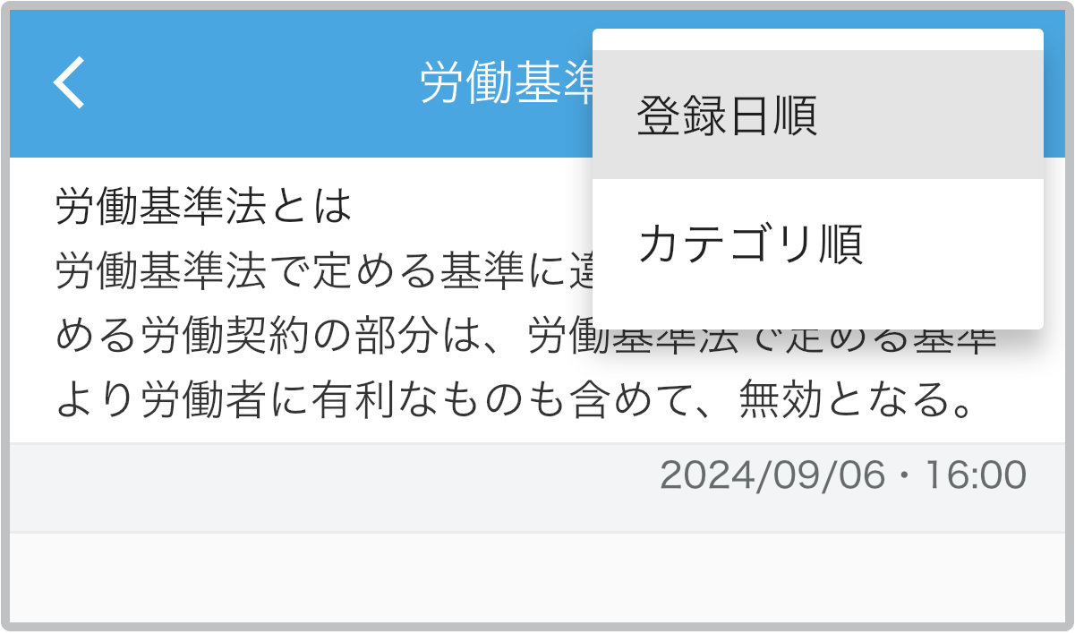 一覧は、ブックマークを登録した日付順の「登録順」、目次の並びで表示する「カテゴリ順」で並び変えることができます。