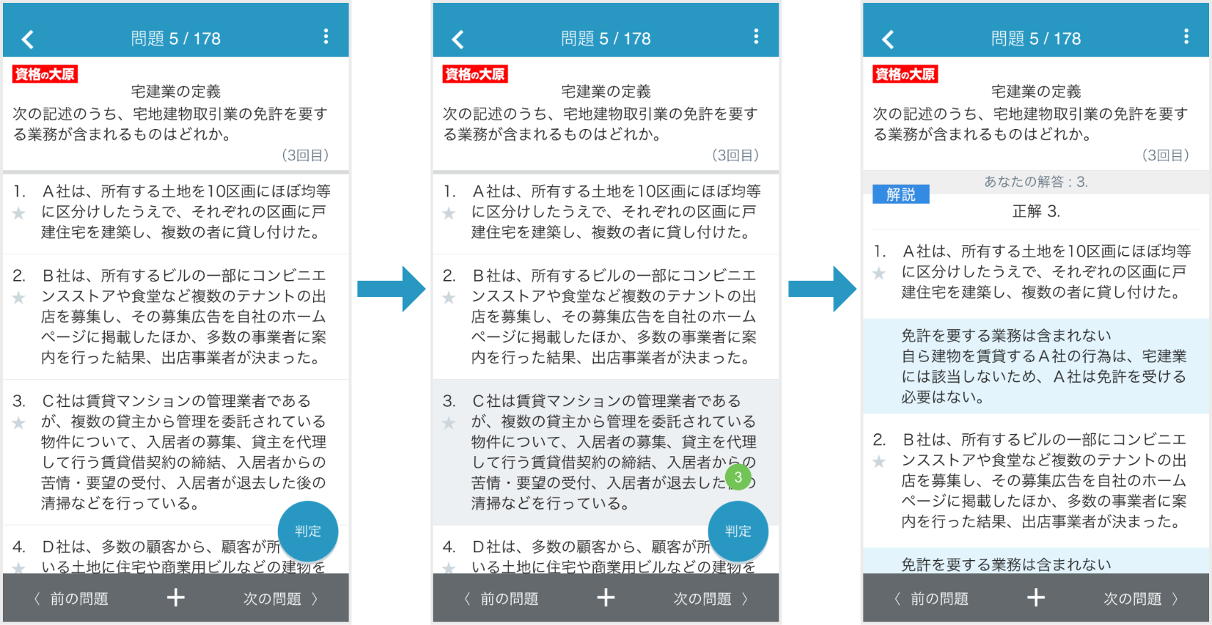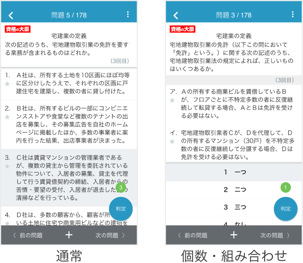 通常形式は、解答選択肢をタップすると、押した項目番号がポップアップされます。そして「判定」ボタンのタップにより、解答が確定され、解説画面に切り替わります。
