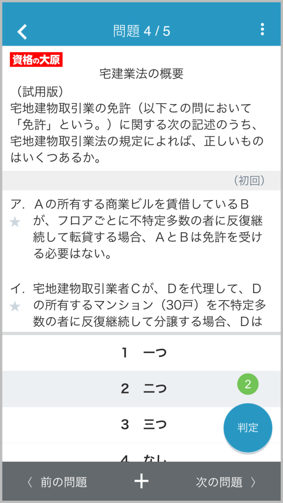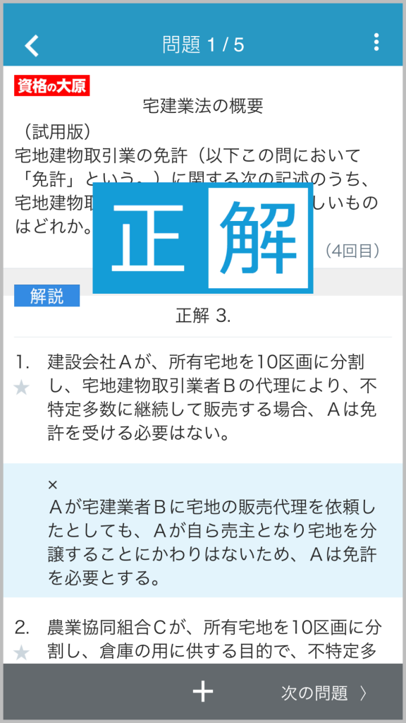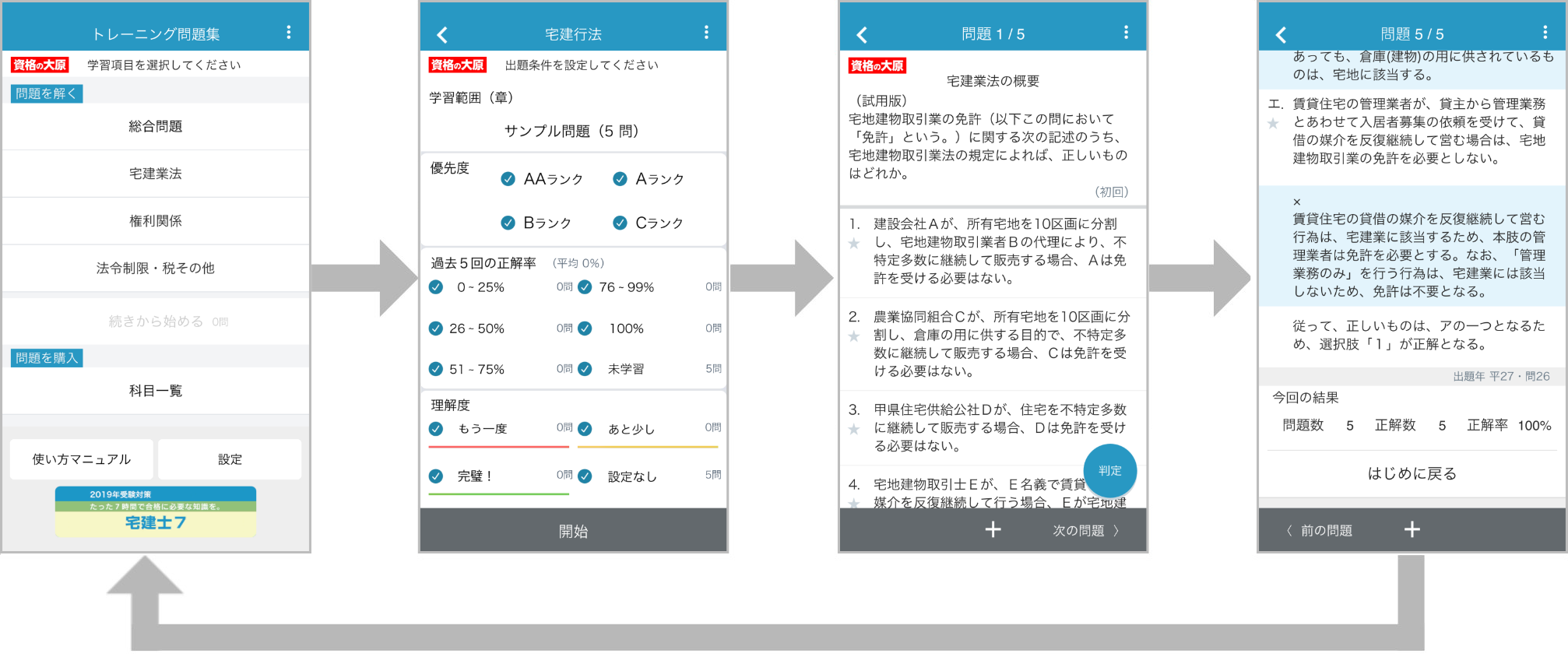 ここでは、サンプル問題を通してどのようなことができるか確認してみましょう。トレ問アプリは、シンプルであることを念頭に学習時に利用する画面は大きく4つになります。