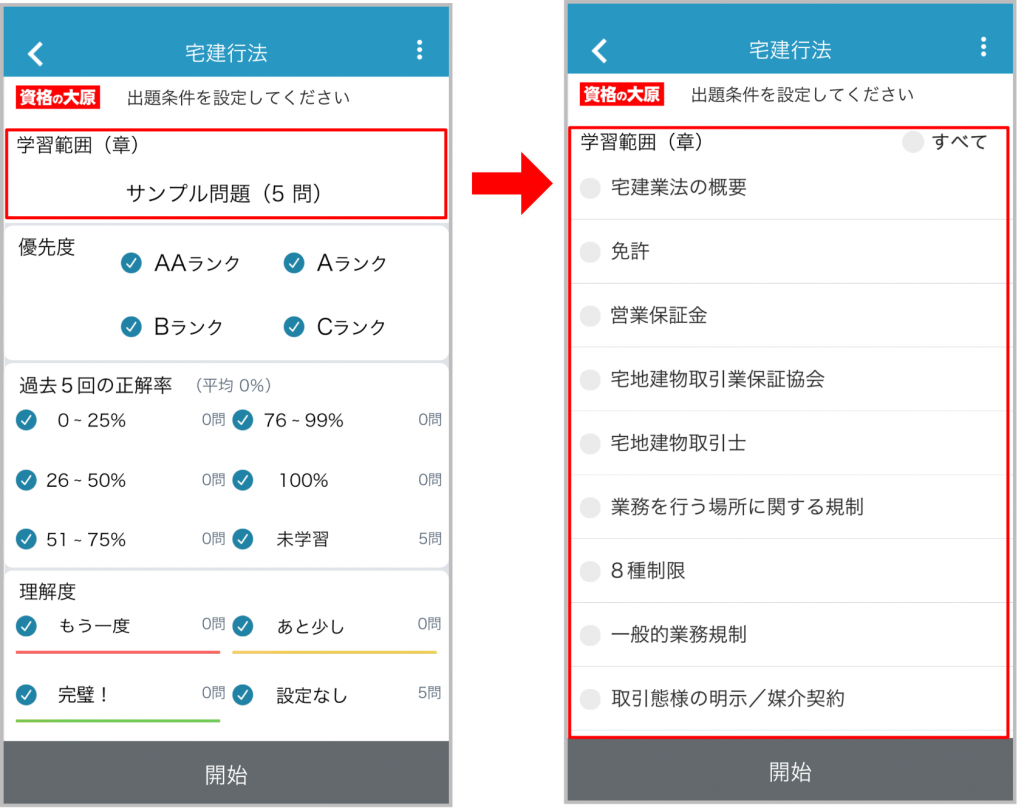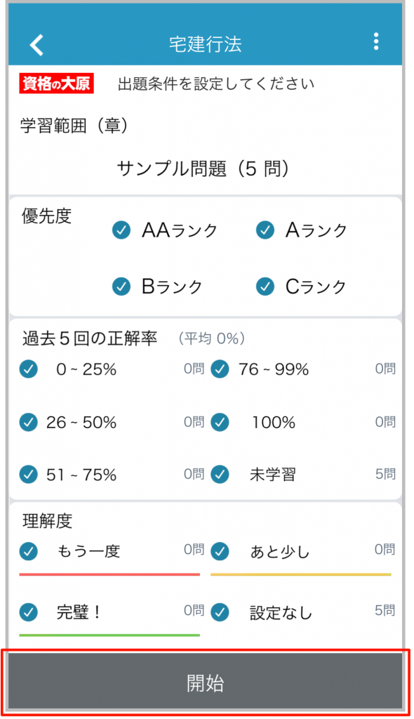条件付けは、正解率の低い問題を出題したり、シャッフル、制限時間を付けたりさまざまな出題の仕方に対応しています。必要に応じて絞り込みをしてください。