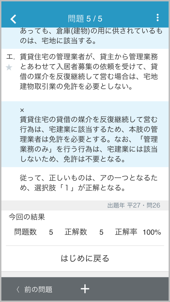 問題の解説および最後に「今回の結果」として正解率を表示します。