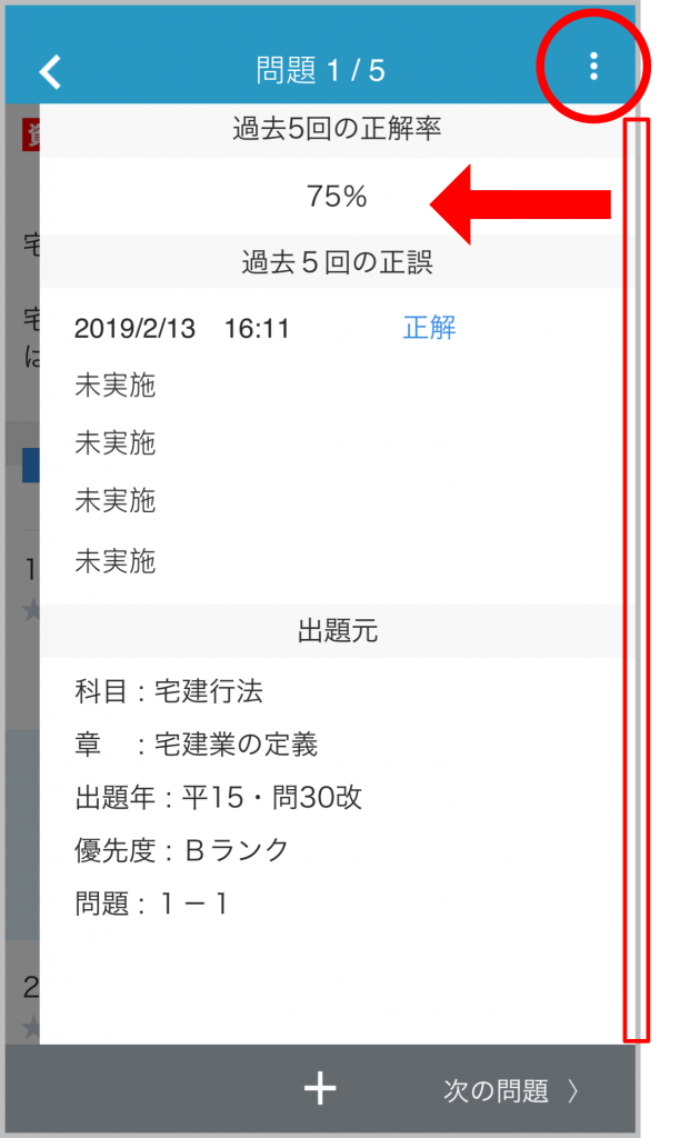 各問題の右上のボタン、または右スミからスワイプを行うと詳細パネルが表示されます。この中には、過去5回の正解率、正誤記録、出題年などの情報を表示します。